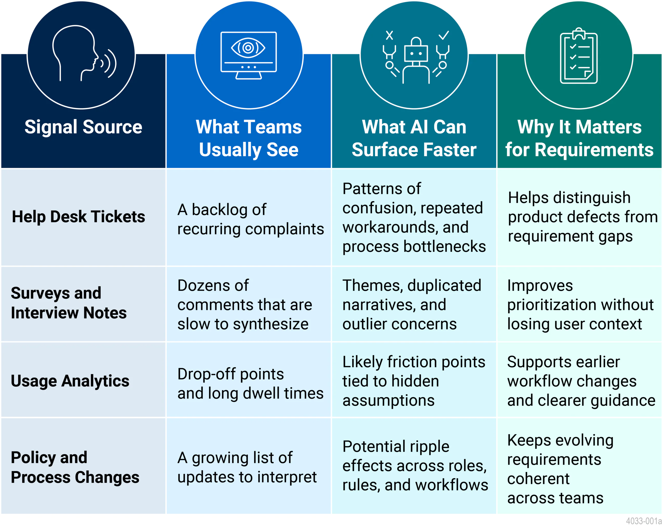 The discipline itself has evolved for the same reason. Workshops, interviews, and documentation reviews are still necessary, but they are no longer enough on their own. Teams now have access to far more evidence, including help-desk tickets, service records, survey feedback, workflow analytics, and policy updates. The challenge is not a lack of information. It is making sense of that information fast enough to improve decisions while the requirements are still forming.